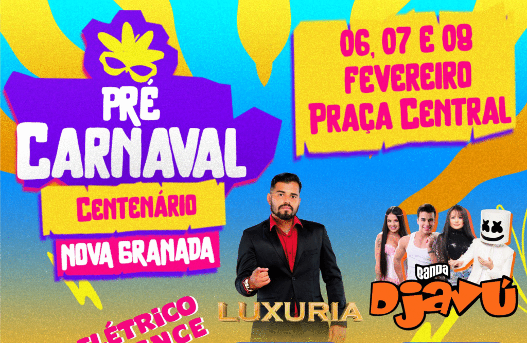 O Departamento de Cultura e Turismo de Nova Granada divulgou a programação oficial do Carnaval do Centenário, que promete ser o maior pré-carnaval da região. A cidade se prepara para celebrar seus 100 anos de história com três dias de música, alegria e emoção, entre os dias 6, 7 e 8 de fevereiro.