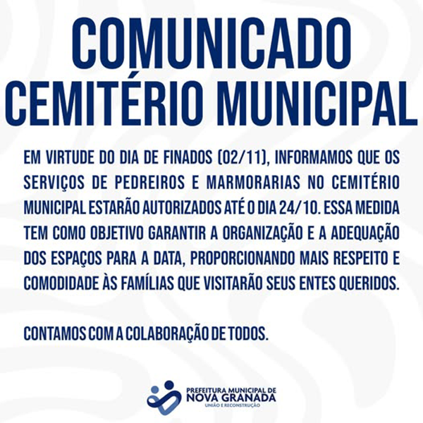 A Prefeitura de Nova Granada divulgou nesta semana, por meio de suas redes sociais oficiais, um comunicado importante relacionado à preparação do Cemitério Municipal para o Dia de Finados, celebrado em 2 de novembro.